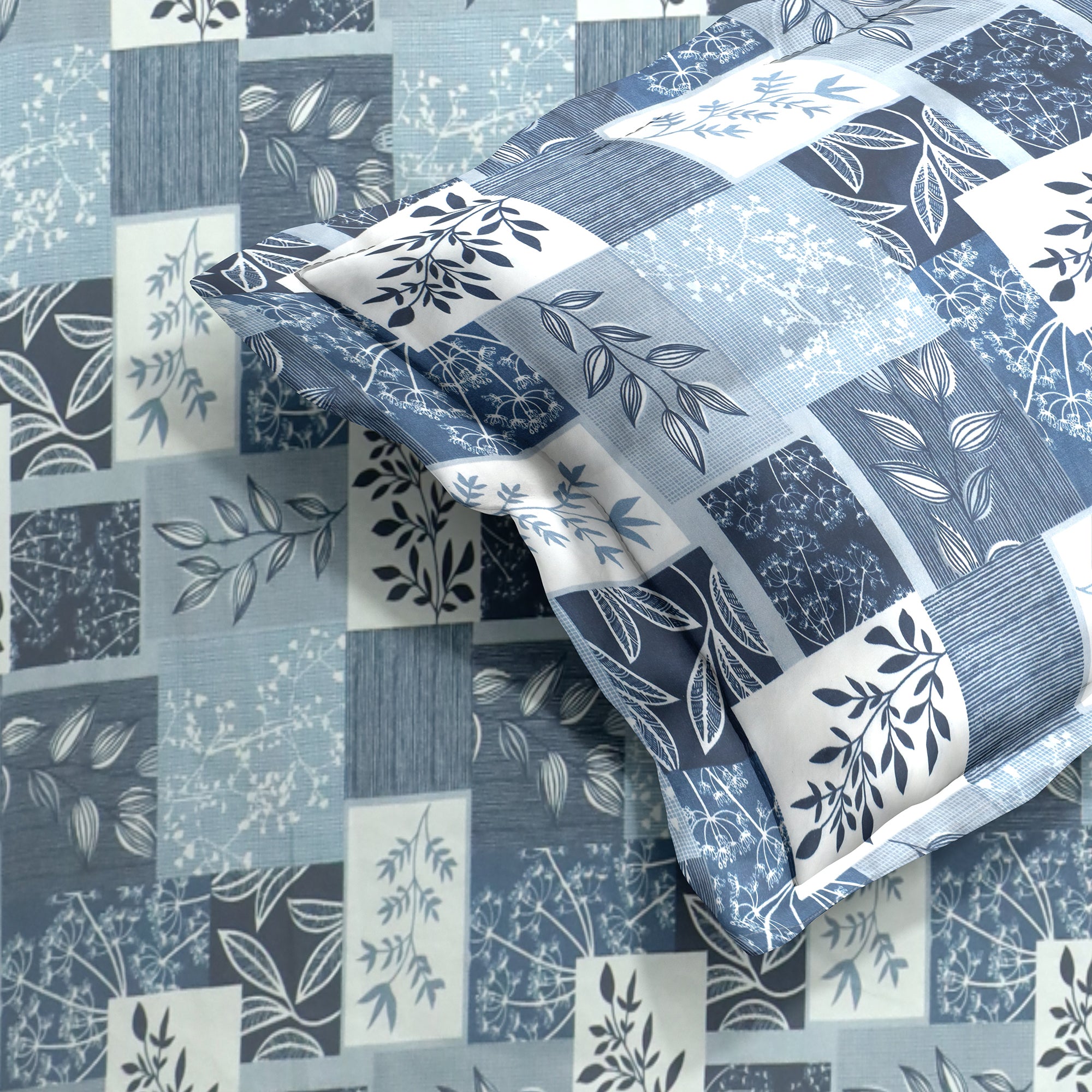 Premium 100% Cotton Double Bedsheet with 2 Pillow Covers – Sky Blue & Mustard Floral Block Pattern