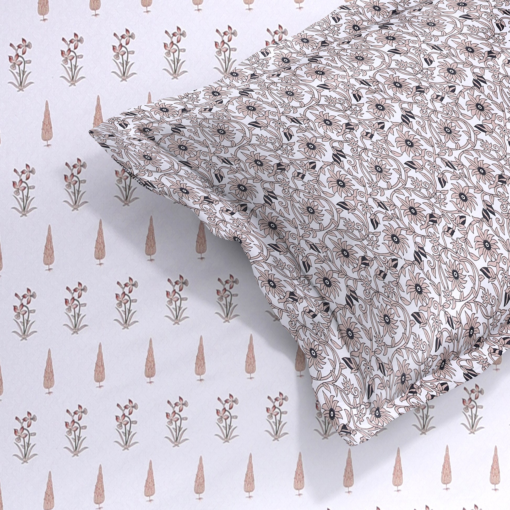 🎨 Design: Soft leafy butti bedsheet with detailed floral pillow covers