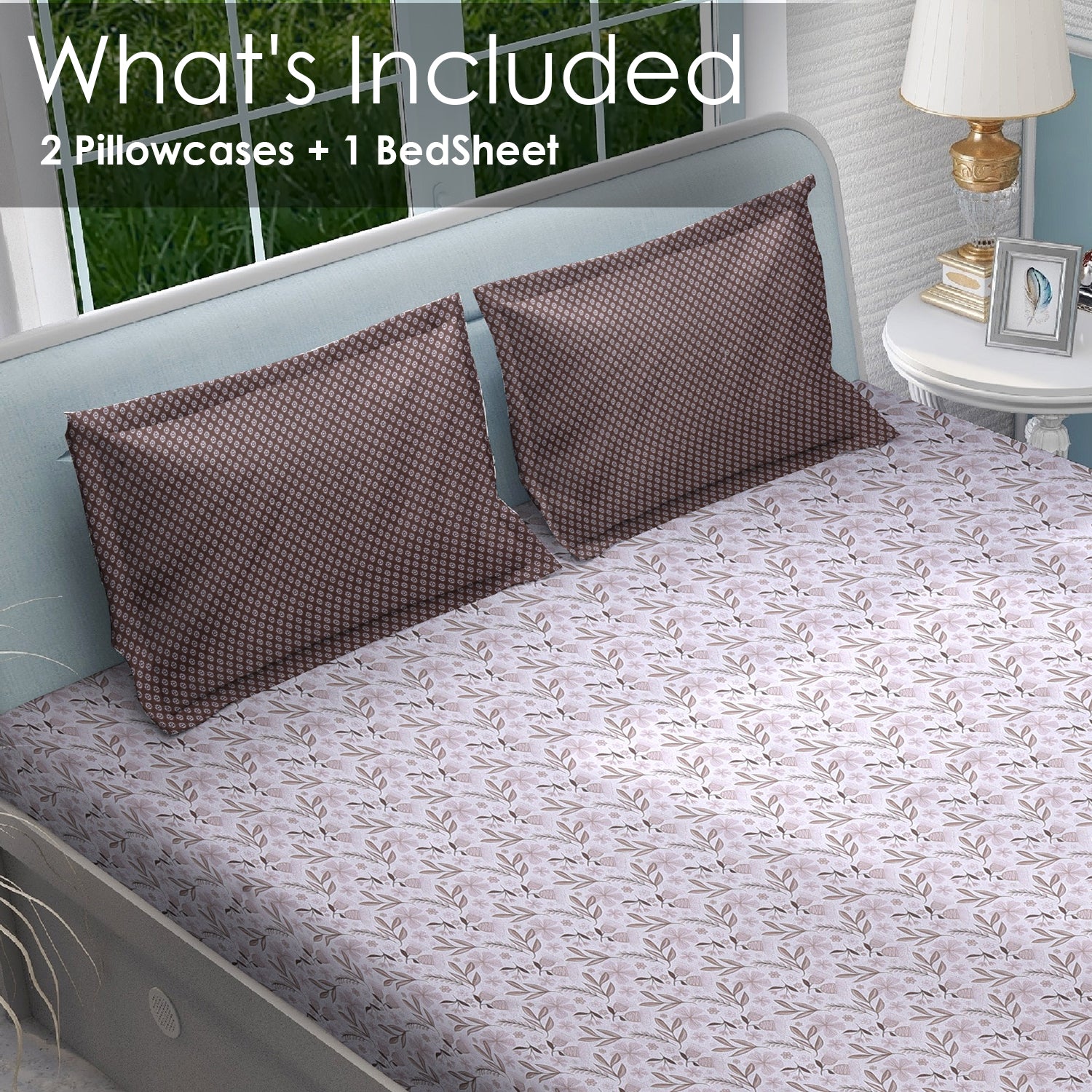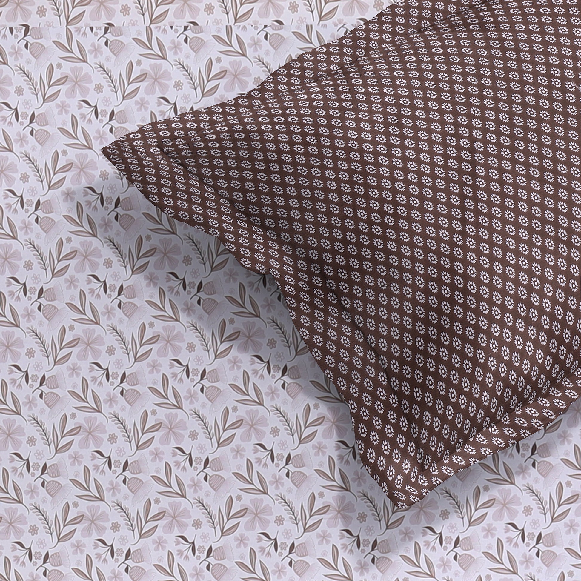 🎨 Design: Soft floral vine bedsheet with contrasting geometric pillow covers