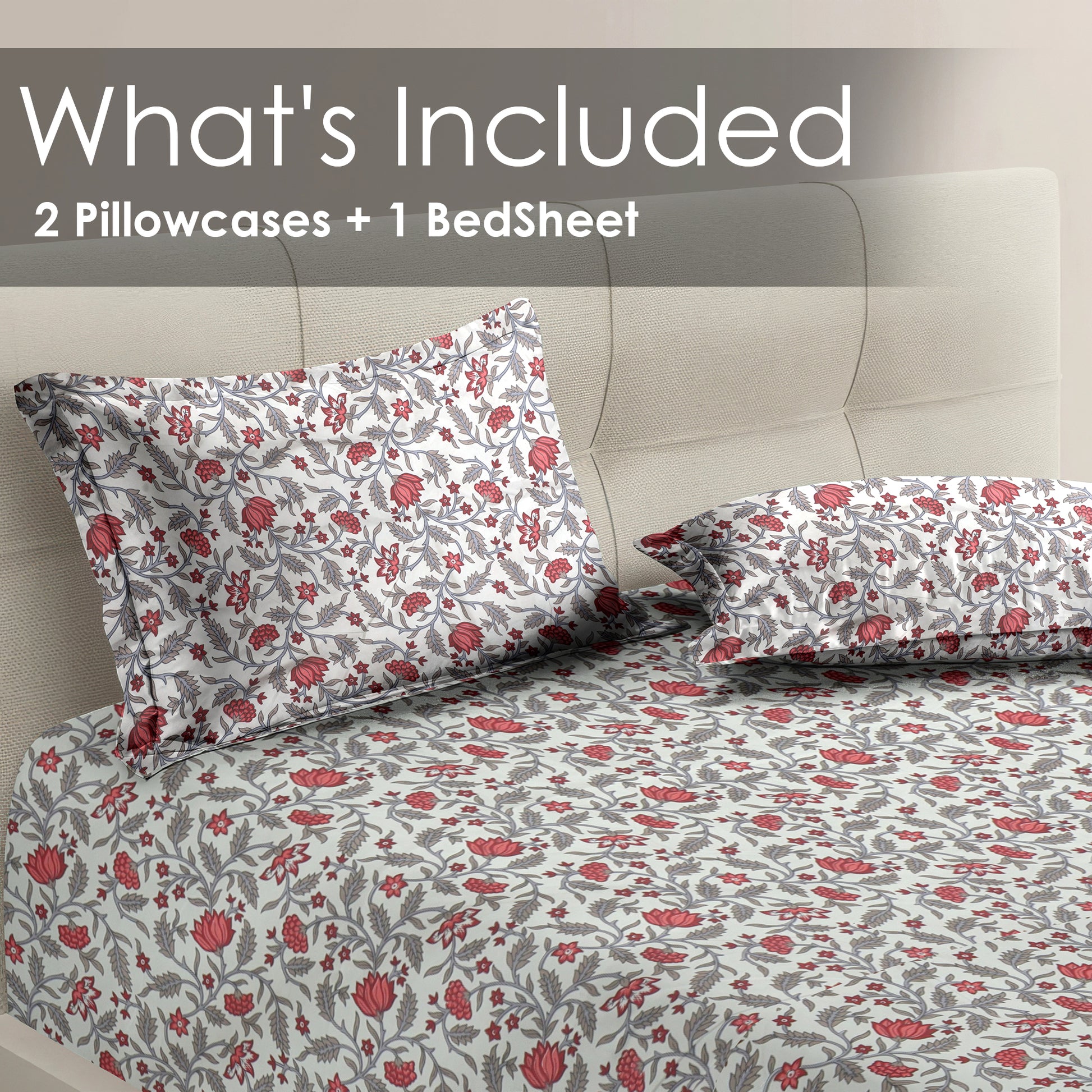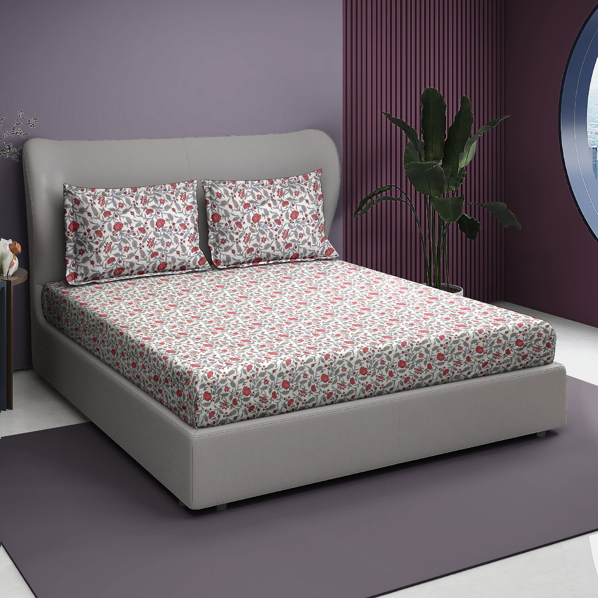 Enhance your bedroom with the timeless beauty of this floral double bedsheet set. The design features elegant red and grey vines printed over a smooth white base β a perfect blend of freshness and charm.